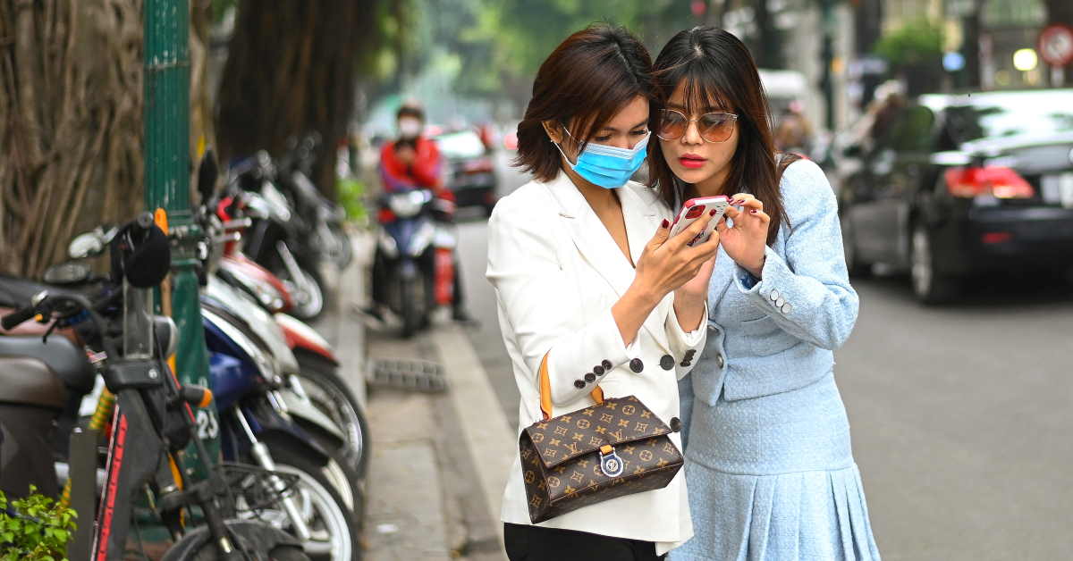 This file photo shows a woman checking her mobile phone with a friend in Hanoi. (AFP Photo)