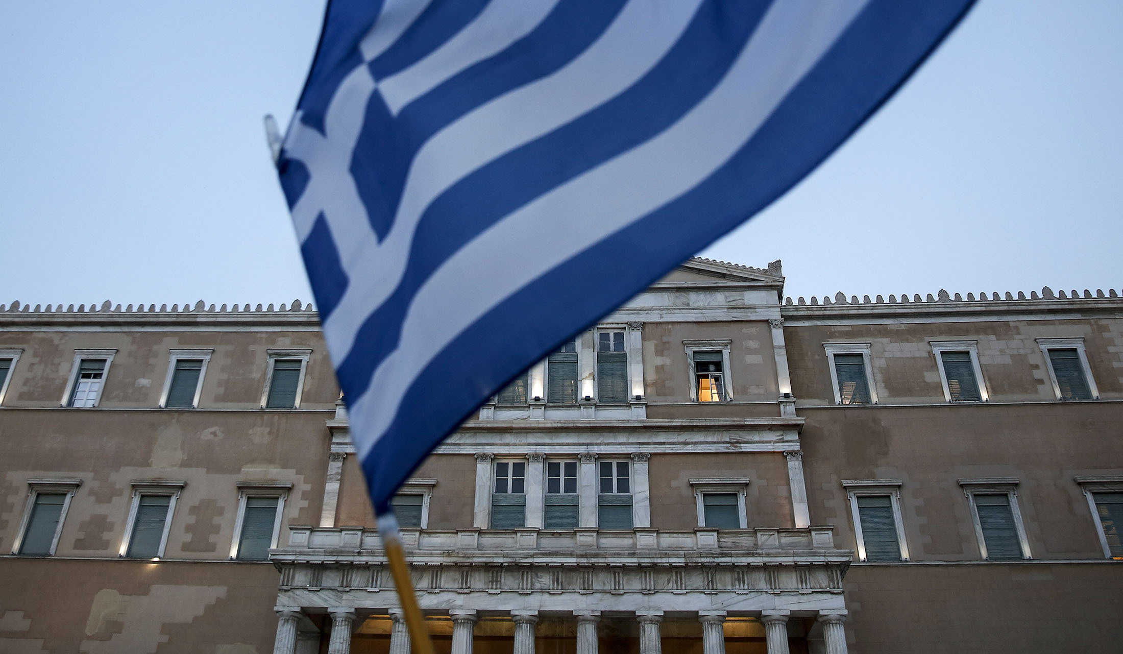 In this picture taken on July 10, 2015, a protestor waves a Greek National flag during an anti-austerity rally in front of the parliament in Athens, Greece. (Bloomberg/Yorgos Karahalis)