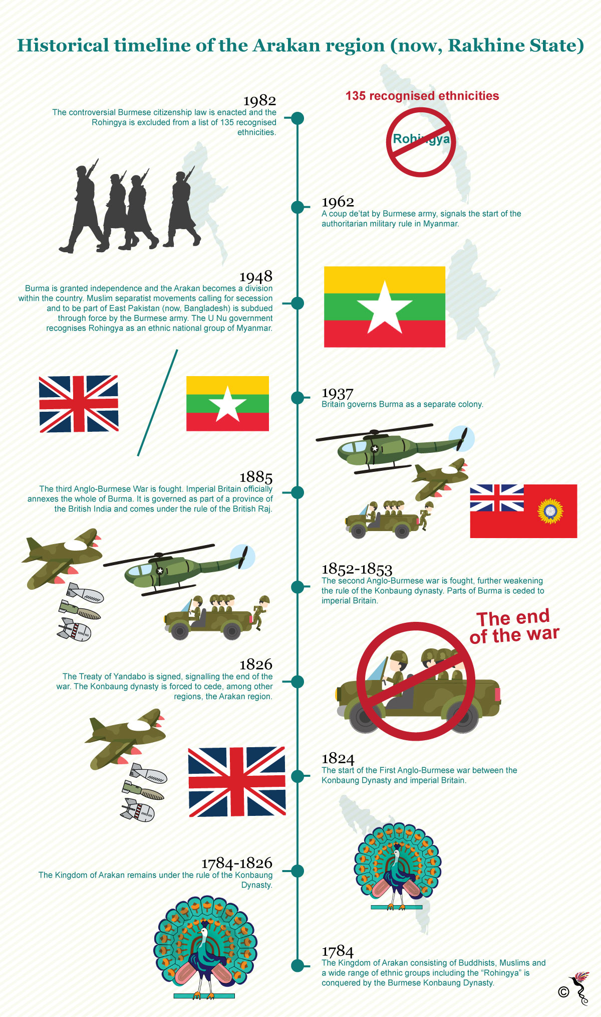 Historically, the Kingdom of Arakan – modern day Rakhine State – and its capital, Mrauk U was a thriving port city made up of Buddhists, Muslims and a wide range of ethnic groups including the “Rohingya”. It controlled the area which is now known as the Rakhine State. In 1784, the kingdom was conquered by the Burmese Konbaung Dynasty until the Burmese ceded Arakan, among other territories to the British in 1826 following their loss in the first Anglo-Burmese War.