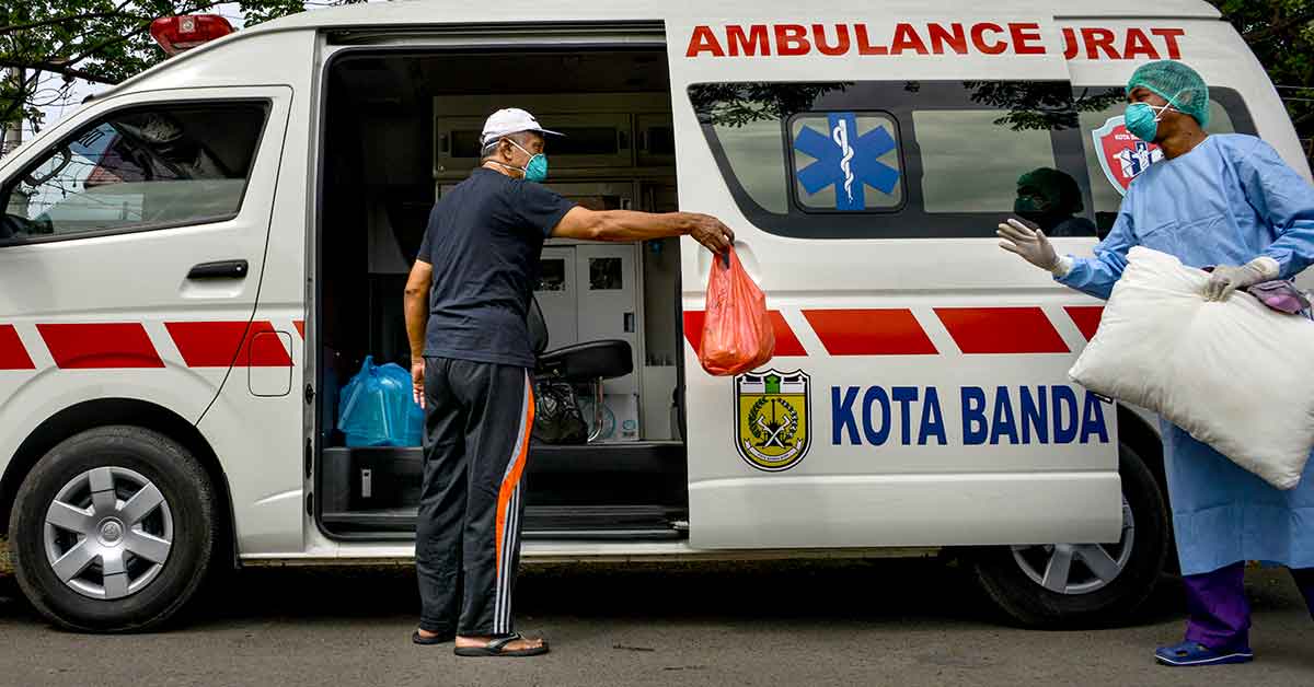 A recovered coronavirus patient (L) gestures to a medical worker before boarding an ambulance to return home from the Zainoel Abidin hospital in Banda Aceh. (AFP Photo)